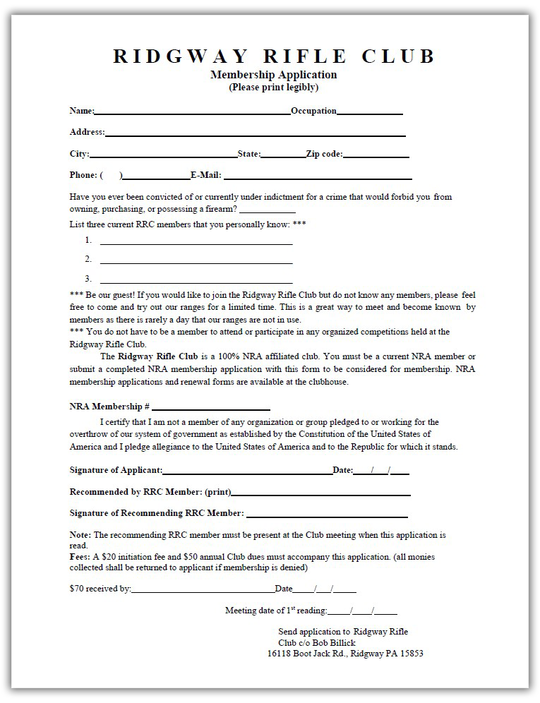 The Ridgway Rifle Club is a 100% NRA affiliated club. You must be a current NRA member or submit a completed NRA membership application with this form to be considered for membership. NRA membership applications and renewal forms are available at the clubhouse.